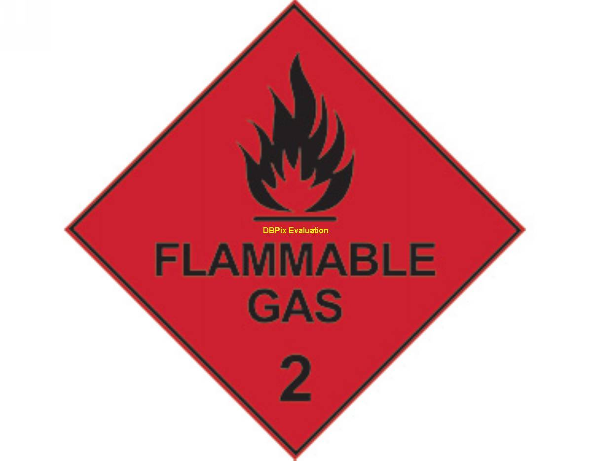 This flammable gas sign features a flame symbol above the words flammable gas followed by a large, bold number 2. The sign comprises a red background with black wording and symbols.